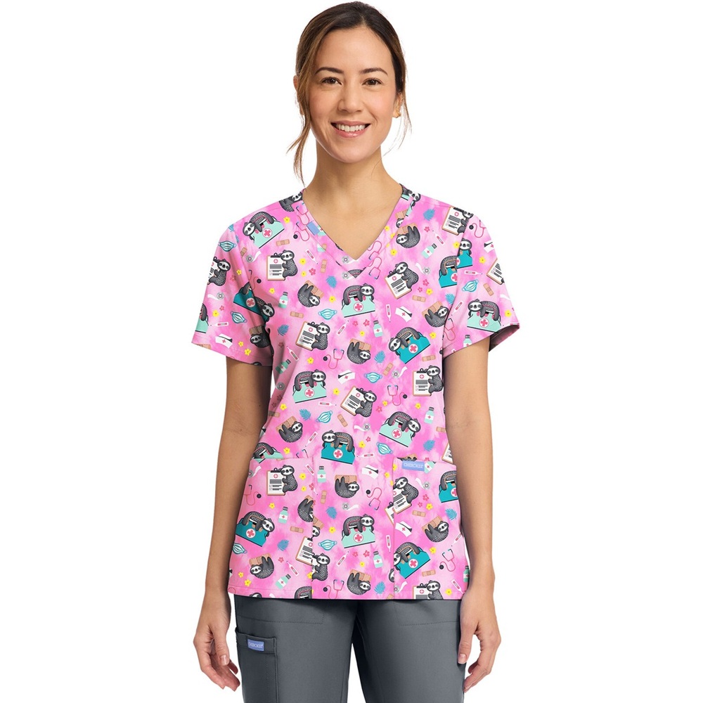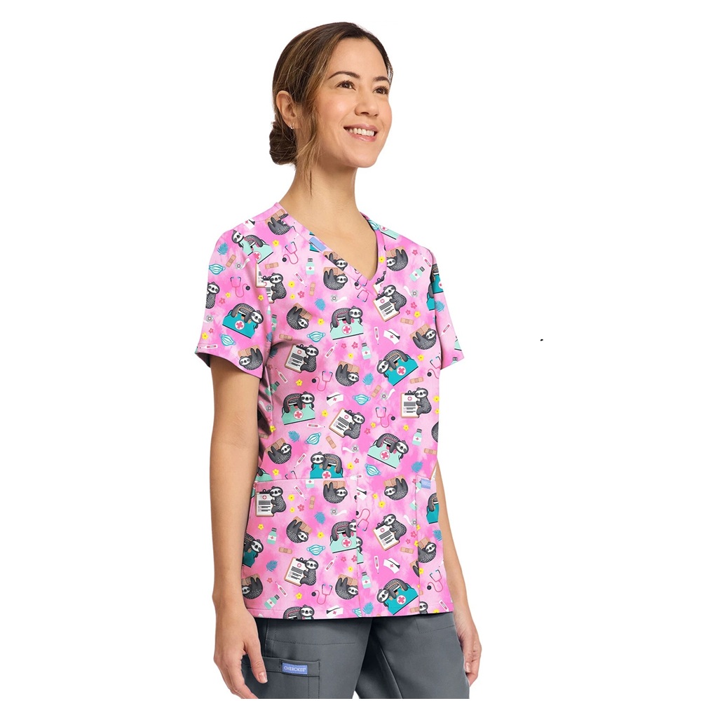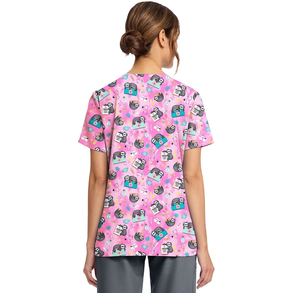 Bluza medyczna we wzorki CK856 NUSH – lekka i przyjazna w codziennej pracy bluza medyczna z kolekcji Cherokee Prints, zaprojektowana z myślą o profesjonalistkach ceniących sobie komfort, styl i funkcjonalność. Wzór z uroczymi leniwcami i elementami medycznymi na różowym tle dodaje charakteru i pozytywnego nastawienia w trakcie dyżurów.