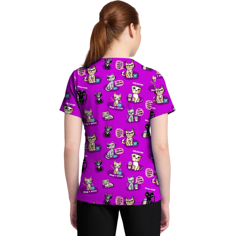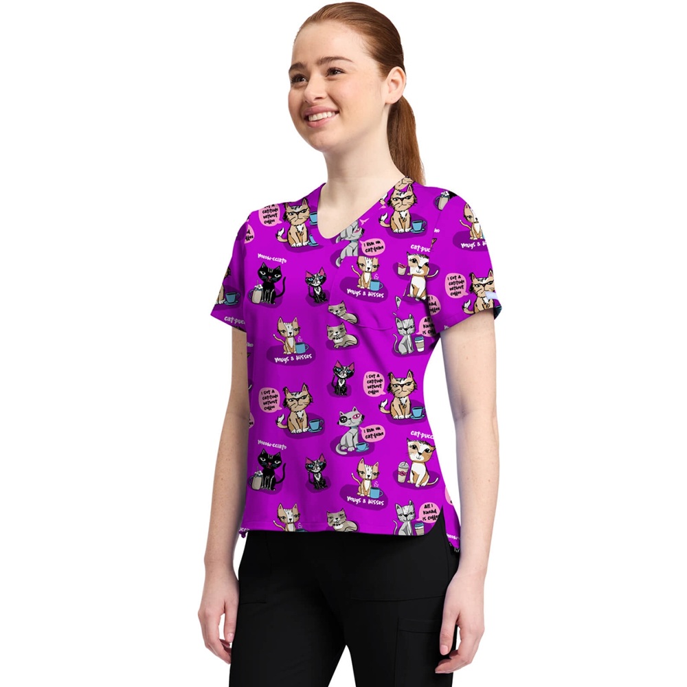 Bluza medyczna damska Cherokee CK857 CFTK to Coffee Talk to nowoczesna bluza medyczna damska z kolekcji Cherokee Prints, zaprojektowana z myślą o wygodzie i funkcjonalności w pracy personelu medycznego. Kolorowy wzór inspirowany motywami kawy i kotów nadaje uniformowi lekko humorystyczny, przyjazny charakter, dzięki czemu świetnie sprawdzi się w gabinetach pediatrycznych, weterynaryjnych czy stomatologicznych.
